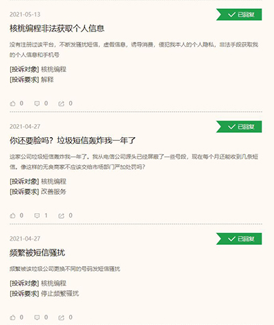 虽然在此之后,核桃编程在课程宣传策略有所调整,并加强对市场推广的约束力度,第一时间处理了近千条不当宣传的信息。但今年仍有部分用户投诉称,接连不断遭到该平台的“营销短信”骚扰。第三方投诉平台显示,有网友反映,自己从未注册过核桃编程的用户,却能收到推广信息;还有用户称已明确表示过拒绝学习,还一直收到推销电话和短信;甚至有用户愤懑的表示,自己已被“骚扰了一年”。