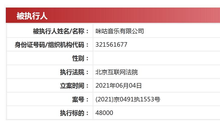 中国执行信息公开网显示,近日,咪咕音乐有限公司新增一则被执行人信息,执行标的4.8万元,案号(2021)京0491执1553号,执行法院为北京互联网法院。