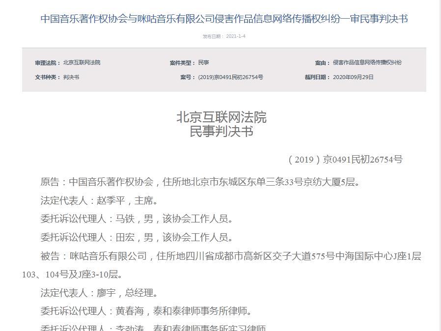 司法信息显示,其关联案件为中国音乐著作权协会与咪咕音乐有限公司侵害作品信息网络传播权纠纷,裁判结果为,被告咪咕音乐有限公司于本判决生效之日起七日内,赔偿原告中国音乐著作权协会经济损失40000元及维权合理费用8000元等。