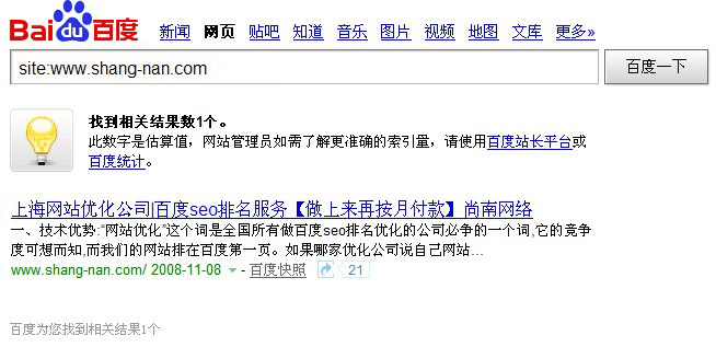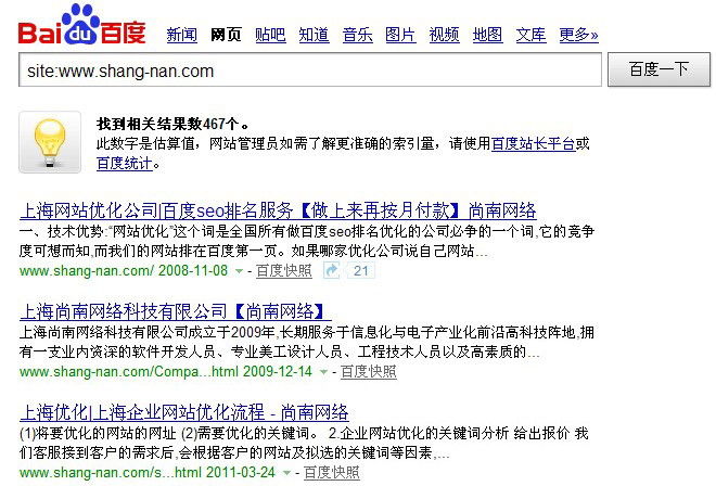 第一、首先通过site:指令来查询网站收录变化,比如说你的网址是www.shang-nan.com,就在百度里搜索“site:www.shang-nan.com”来查询你的网站收录情况,site指令查询结果主要有以下几种情况: