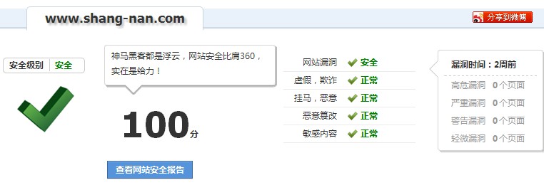 网站木马检测方法我们推荐使用360网站安全检测工具,在网上搜索下“360网站安全检测工具”,打开网站,输入您的网址就可以检测了,方法非常的简单、易用,不需要专业人士的指导就可以检测出网站的健康状况。检测分数一定要在85分以上才算可以,我们的网站检测分数都是100分。