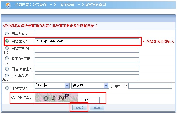 在页面右边会出现查询条件窗口中输入查询条件及验证码,点击“提交”即可。以按照“网站域名”查询为例,如下图